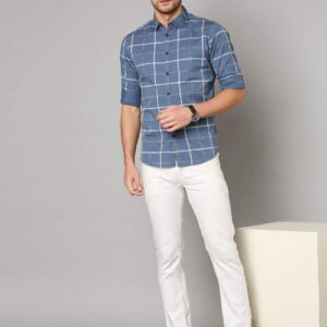 ₹700.00Brand: Dennis Lingo Color: Dusty Blue Features: Material Composition: 100% Cotton Pattern: Checkered Fit Type: Slim Fit Sleeve Type:...