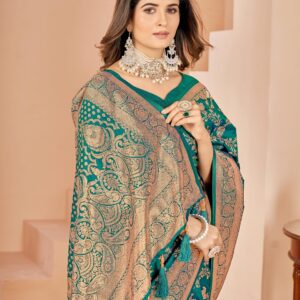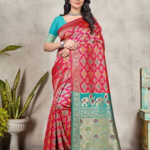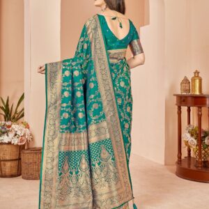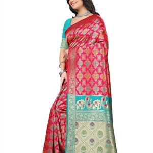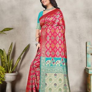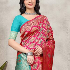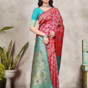 ₹20,000.00Brand: Prisha Enterprise Color: Red And Turquoise Features: PREMIUM FABRIC: Luxurious Banarasi silk saree crafted with traditional jacquard weaving...