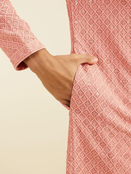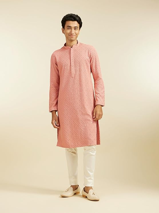- Fashion: Turn up the charm in this coral peach chikankari kurta, dazzling with sequins. It’s all about that trendy-meets-traditional vibe, making you look effortlessly dapper. Style it with white churidar and leather loafers for a look that’s totally on point and perfect for any festive occasion.