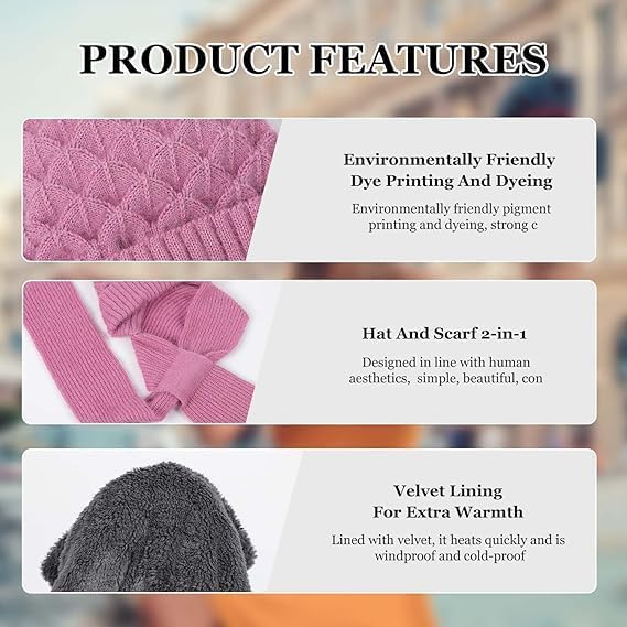 - HIGH QUALITY MATERIAL :- Stylish Winter Wear Muffler cap With Modern Pattern Style Design That Keeps Your Neck And Chest Warm,Our Windproof Cap Scarf is crafted from wool & premium polyester, ensuring a soft and skin-friendly experience. The material of this womens beanie, and scarf is made of acrylic fibers, It’s cold-resistant down to -15℃, providing optimal comfort and warmth. The material is fade-resistant and resistant to pilling, ensuring long-lasting durability.