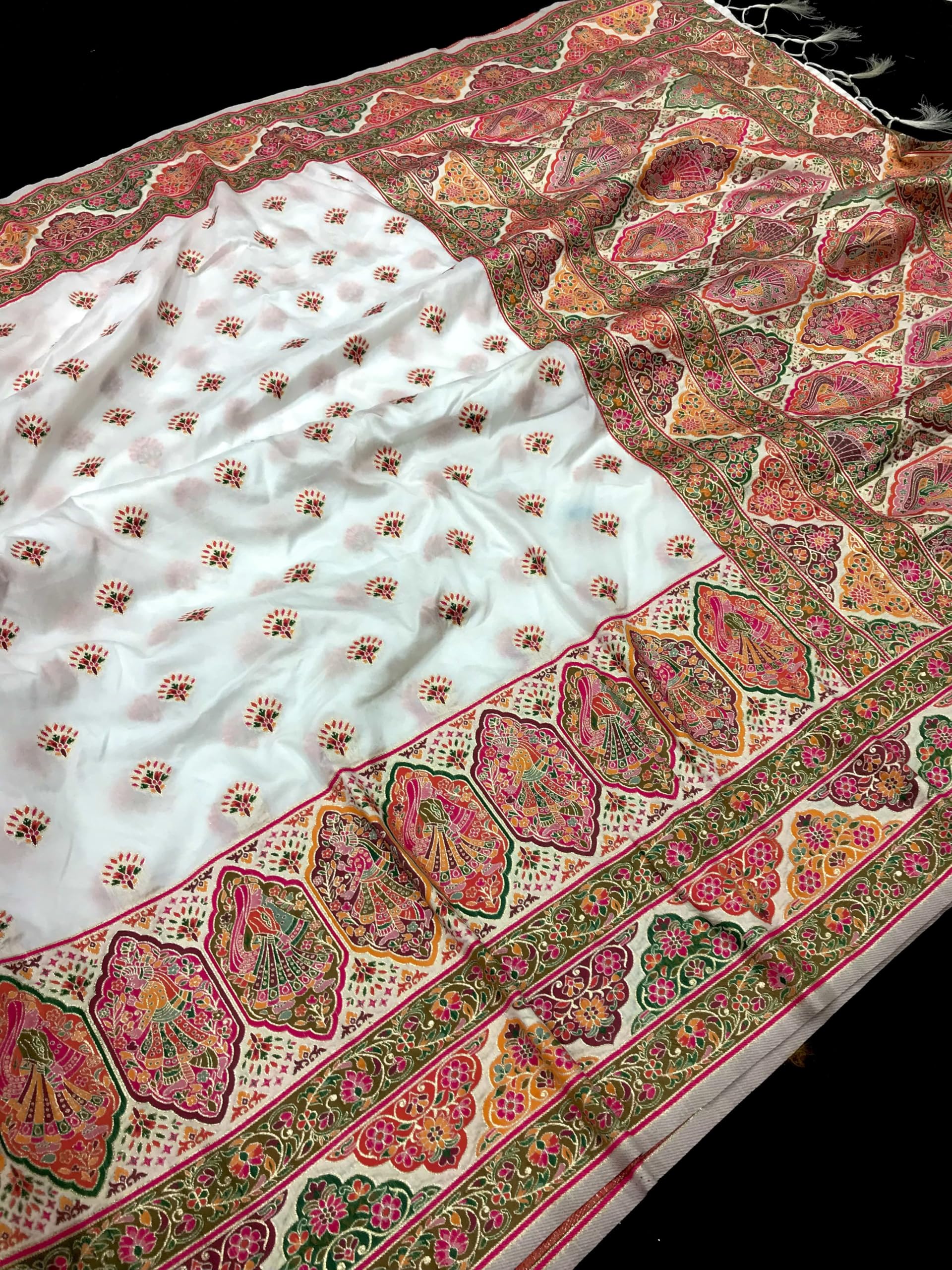 Jacquard lithi silk sarees are a luxurious choice, known for their intricate patterns and rich texture. These sarees often feature a blend of traditional and contemporary designs, showcasing ornate motifs woven into the fabric using a jacquard loom.