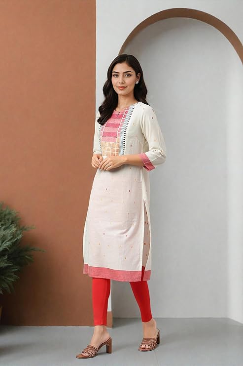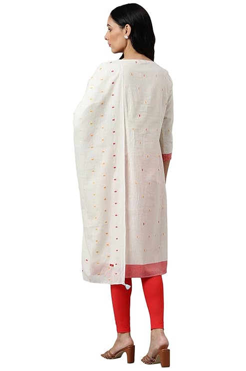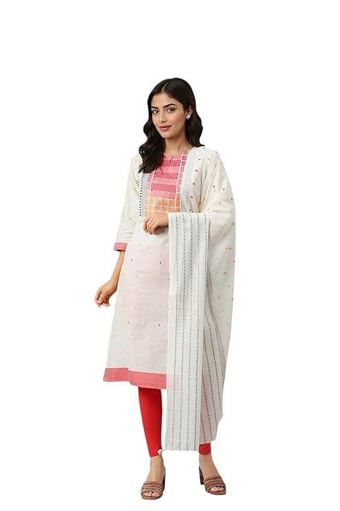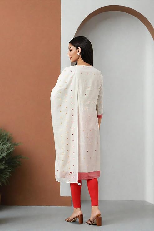 - Make a statement with this ecru kurta, dupatta, and bottomwear set from W. The geometric pattern adds a modern touch to traditional wear. Crafted from a cotton-rayon blend, this set offers comfort and style in one package.