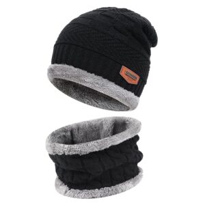 Fantastic Zone Kids Winter Beanie Hat and Scarf Set Warm Knit Beanie Cap and Circle Scarf with Fleece Lining for Kids Boys Girls, 2-Pieces Black